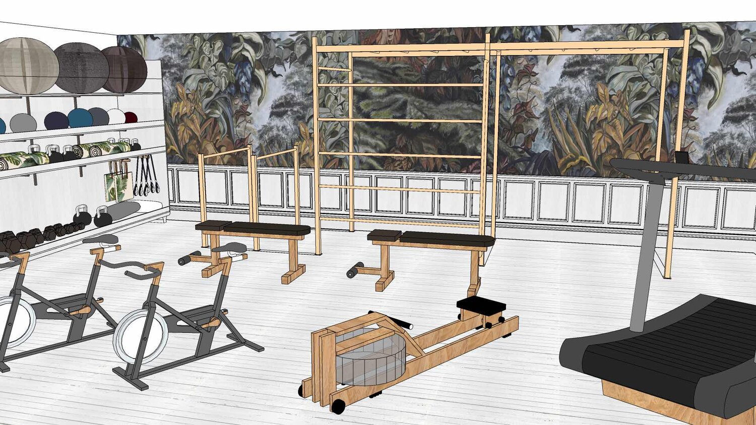 Finally then, in this concept we have added a final nature gym flourish with a botanical wallpaper that adds both a element of biophilia, bringing the outside world in, as well as a note of elegance that is often missing from a gym interior. These design elements contribute to creating a luxury gym atmosphere, enhancing the overall workout experience with high-quality materials and exclusive aesthetics.