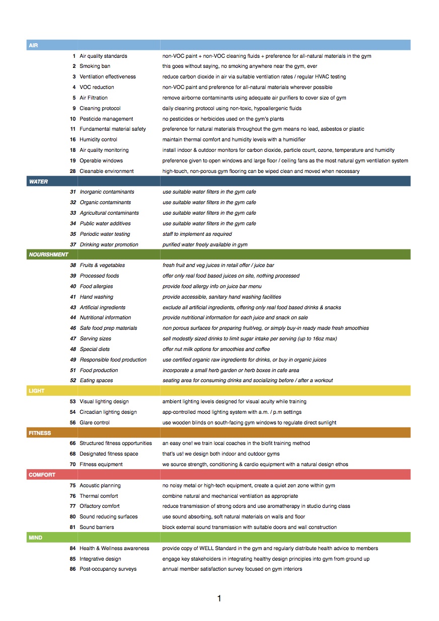 In summary, a total of 32 items from Air, Light, Fitness, Comfort and Mind are covered by our core gym product (shown in standard font below) while the addition of a health bar or retail fridge at the gym reception would help tick off an additional 18 from the Water and Nourishment sections (shown in italics below).