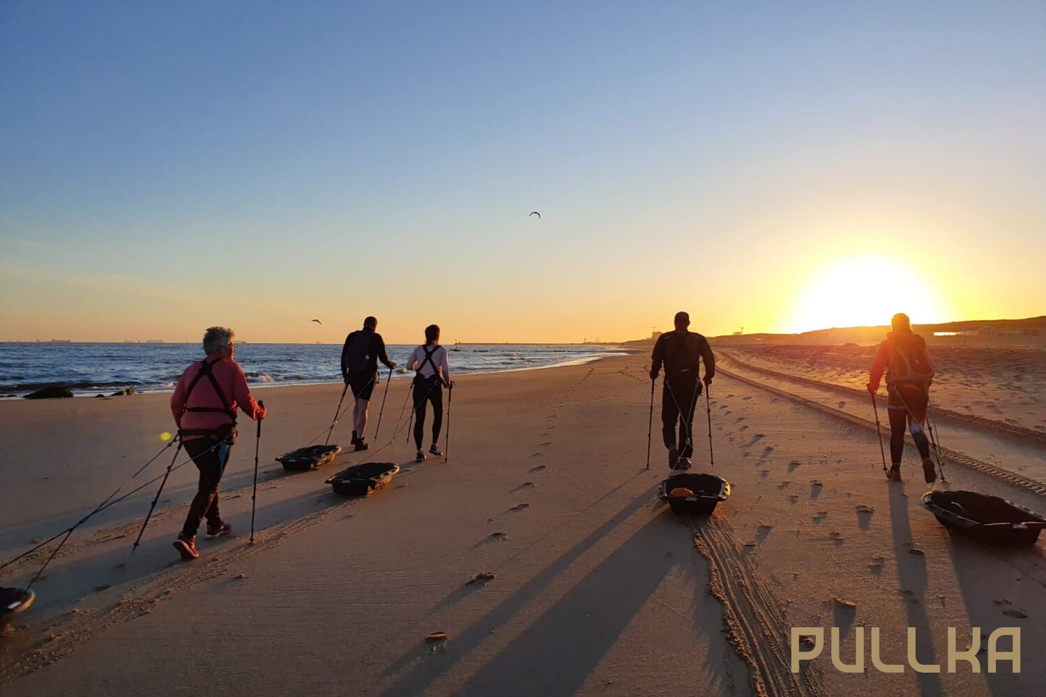 This worldwide new training method is based on the oldest way of human transport: the sled. The essence is to pull this sled (pulk) with ballast through beautiful nature: beach, dunes, forests, meadows.