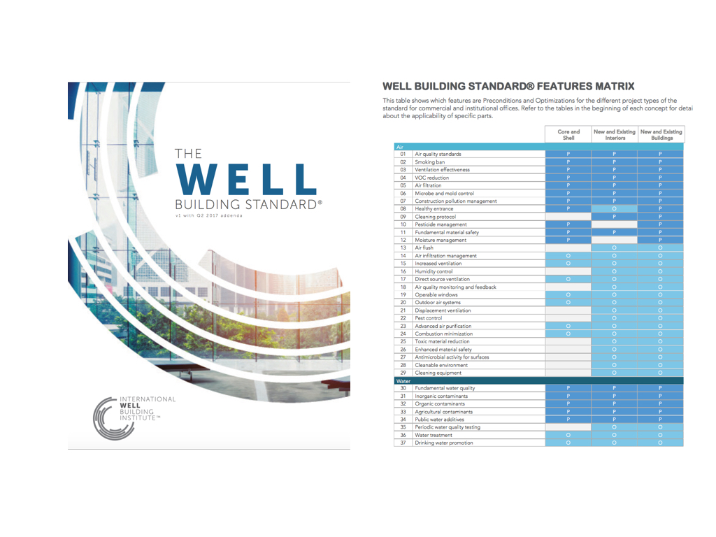 So LEED looks at reducing water and electricity use by integrating natural light and ventilation into a building for example with view to minimizing the harm we do to the planet and for the health of those using the building, while WELL is oriented more towards the human element looking at air quality as well as availability of fresh fruit, filtered drinking water, the promotion of stair use, on-site bicycle parking and so on.