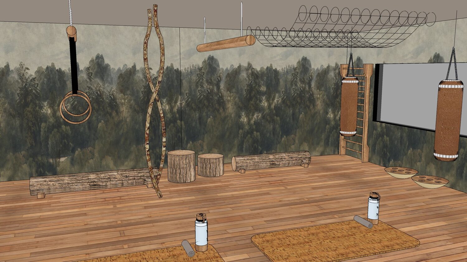This forest gym or jungle gym concept is designed to show that there is a viable alternative to the kids jungle gym set-up for an adult audience, at least for business owners brave enough to step away from th conventions that dominate the gym design industry today.